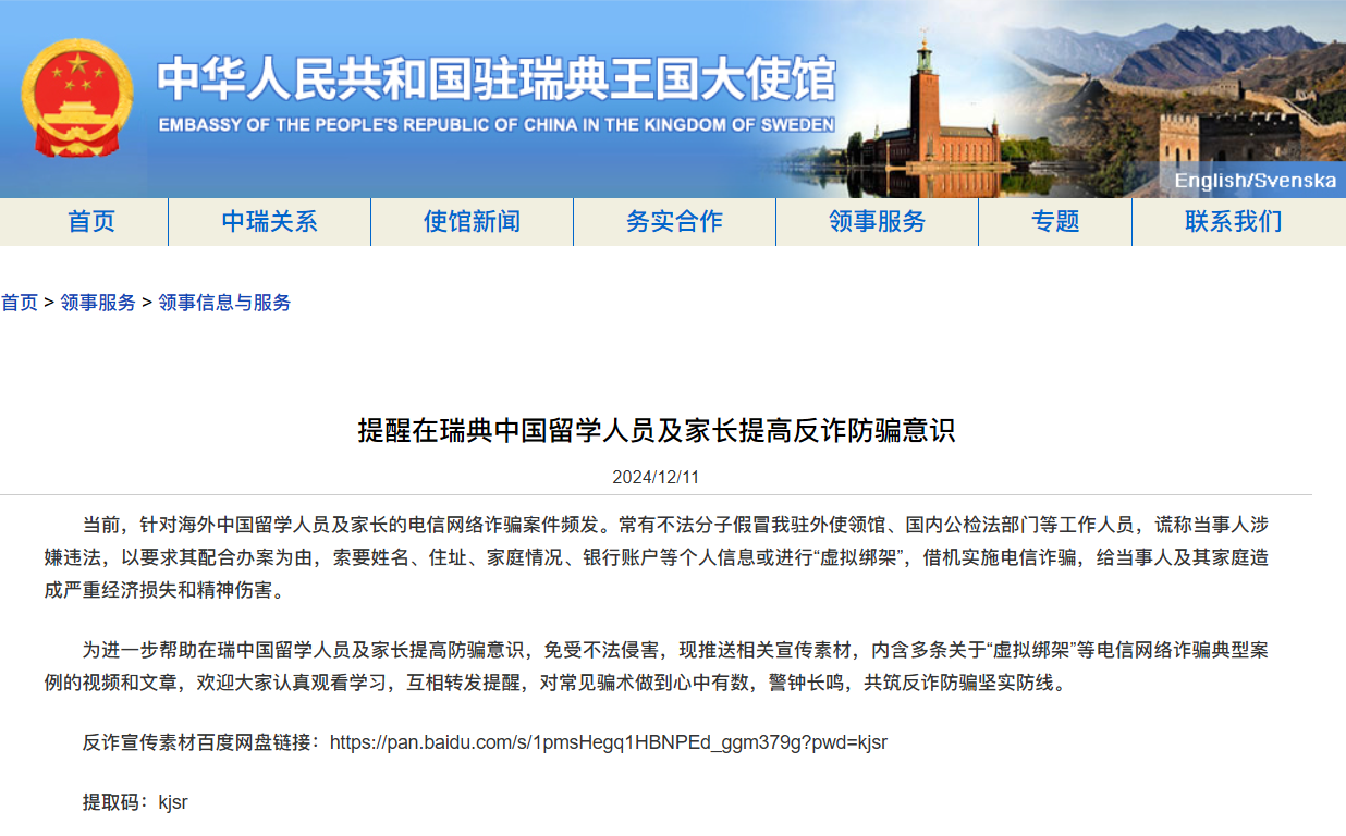 駐瑞典使館:提醒留學(xué)人員及家人提高反詐防騙意識(shí)