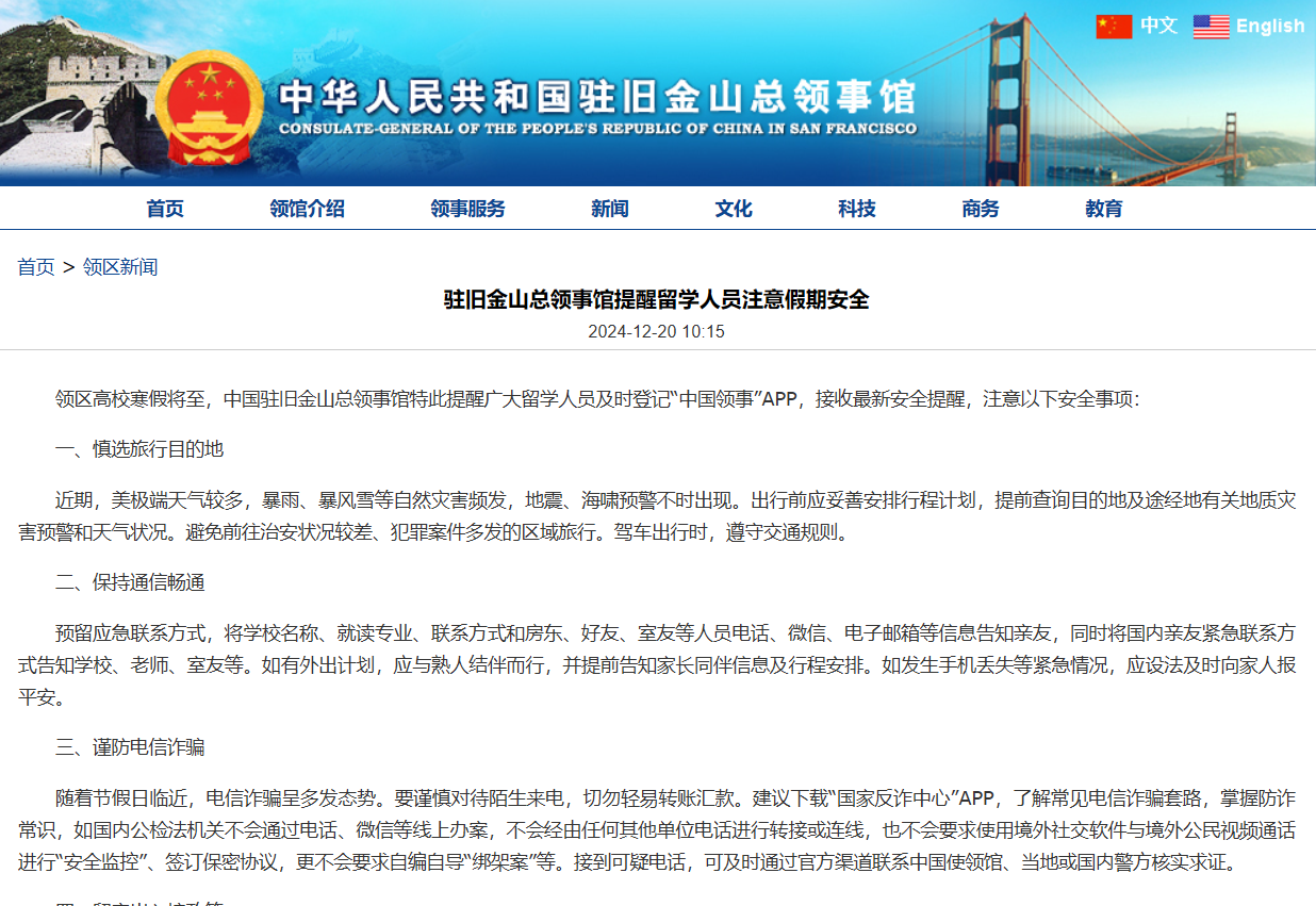 寒假已至,駐舊金山總領(lǐng)館提醒廣大留學(xué)人員及時(shí)登記“中國(guó)領(lǐng)事”APP,接收最新安全提醒。出行前應(yīng)妥善安排行程計(jì)劃,提前查詢目的地及途經(jīng)地有關(guān)地質(zhì)災(zāi)害預(yù)警和天氣狀況。避免極端天氣和治安較差的區(qū)域,駕車出行遵守交通規(guī)則。保持通信暢通,預(yù)留應(yīng)急聯(lián)系方式,告知親友行程安排。謹(jǐn)防電信詐騙,不輕信陌生來電,切勿輕易轉(zhuǎn)賬匯款。建議下載“國(guó)家反詐中心”APP,了解常見電信詐騙套路,掌握防詐常識(shí)。實(shí)時(shí)關(guān)注美國(guó)留學(xué)、簽證、出入境政策變化,關(guān)注學(xué)校官網(wǎng)和國(guó)際學(xué)生辦公室的提醒。