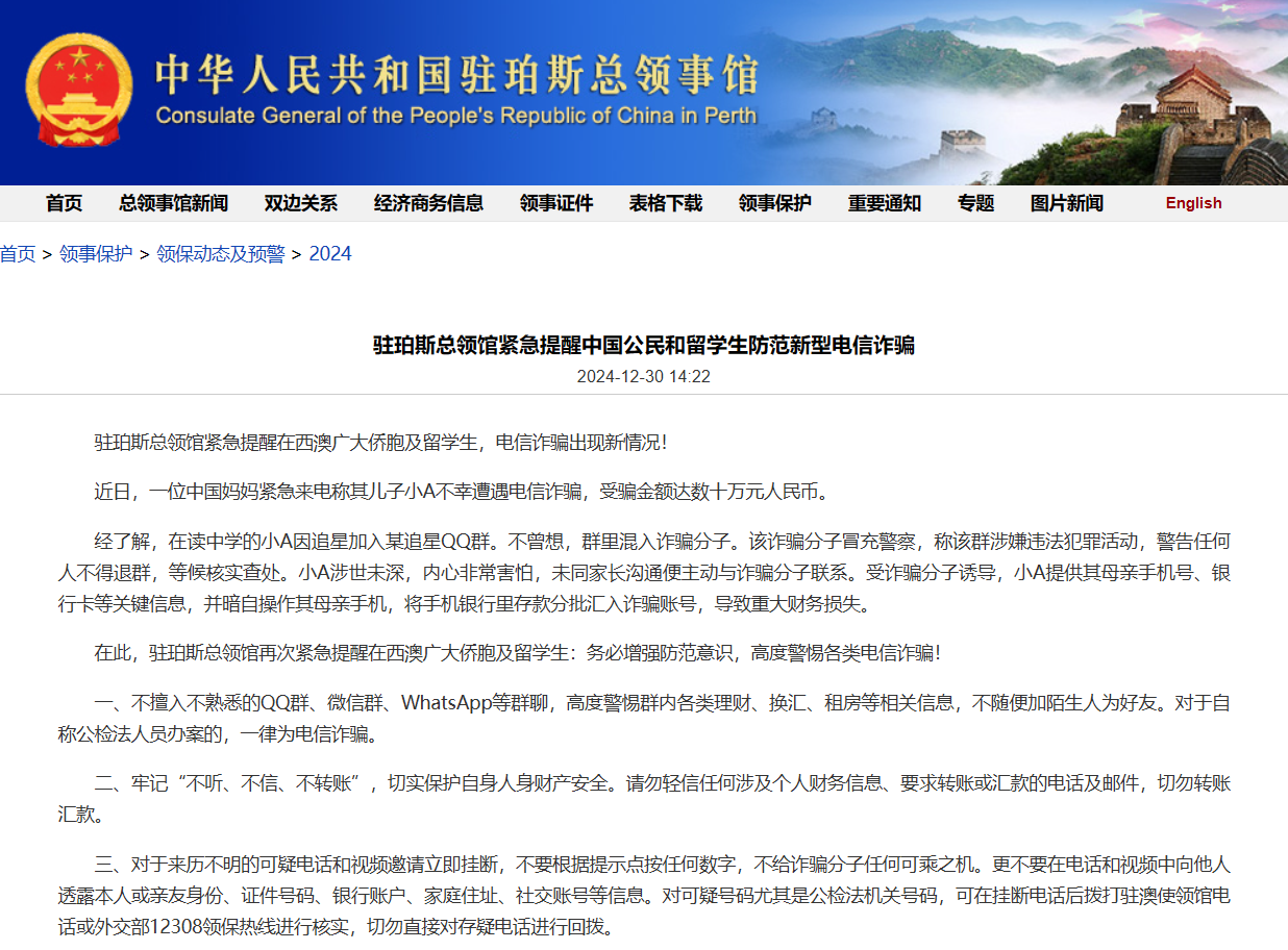 駐珀斯總領(lǐng)館緊急提醒在西澳留學(xué)生加強(qiáng)防范電信詐騙,避免加入不熟悉的群聊,警惕群內(nèi)理財(cái)、換匯等信息,不加陌生人為好友。對(duì)自稱公檢法人員的,一律視為詐騙。牢記“不聽、不信、不轉(zhuǎn)賬”,保護(hù)個(gè)人財(cái)產(chǎn)安全。對(duì)可疑電話和視頻邀請(qǐng)立即掛斷,不透露個(gè)人信息。如不幸上當(dāng)受騙,請(qǐng)第一時(shí)間向當(dāng)?shù)鼐綀?bào)案。如系通過國(guó)內(nèi)銀行卡向?qū)Ψ睫D(zhuǎn)賬,可同時(shí)向戶籍所在地公安機(jī)關(guān)報(bào)案。