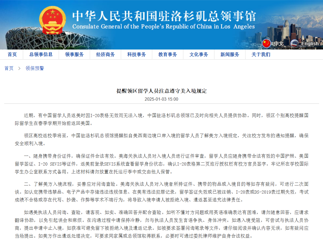 此外,近期有中國(guó)留學(xué)人員返美時(shí)因I-20表格無效無法入境,駐洛杉磯總領(lǐng)館已及時(shí)向相關(guān)人員提供協(xié)助。同時(shí)返校季將至,駐洛杉磯總領(lǐng)館提醒擬自美西南邊境口岸入境的留學(xué)人員確保攜帶合法有效的中國(guó)護(hù)照、美國(guó)留學(xué)簽證、I-20 SEVIS等證件,返美前登錄SEVIS系統(tǒng)查看留學(xué)身份狀態(tài),并確認(rèn)I-20表格旅行授權(quán)欄有校方官員簽字。了解美方入境流程,避免攜帶違禁品或存儲(chǔ)違法信息,以防被拒絕入境、遣返或追究法律責(zé)任。重要證件勿放托運(yùn)行李或交他人保管,并牢記學(xué)校國(guó)際學(xué)生辦公室聯(lián)系方式。遇美執(zhí)法人員問詢時(shí),客觀如實(shí)回答并配合查驗(yàn),如語言困難請(qǐng)求翻譯,避免隨意回答。保持冷靜,避免爭(zhēng)執(zhí)。入境受阻可協(xié)商中止入境,避免遣返記錄。簽署文件前仔細(xì)閱讀,有疑問當(dāng)場(chǎng)提出。如被遣返,可聯(lián)系家屬或總領(lǐng)館,必要時(shí)委托律師。