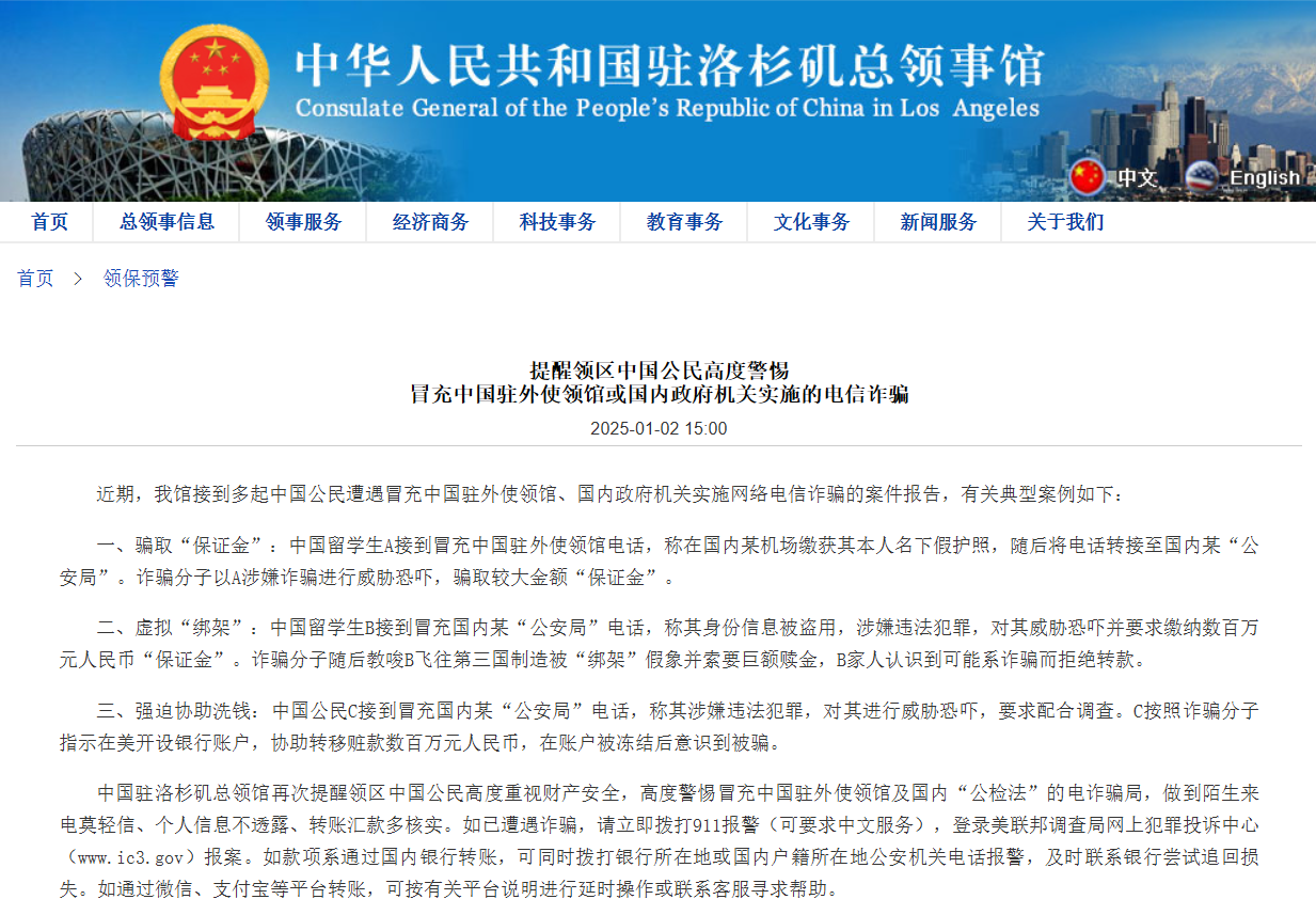 駐洛杉磯總領(lǐng)館:警惕冒充中國(guó)駐外使領(lǐng)館或國(guó)內(nèi)“公檢法”的電信詐騙 注意遵守美入境規(guī)定