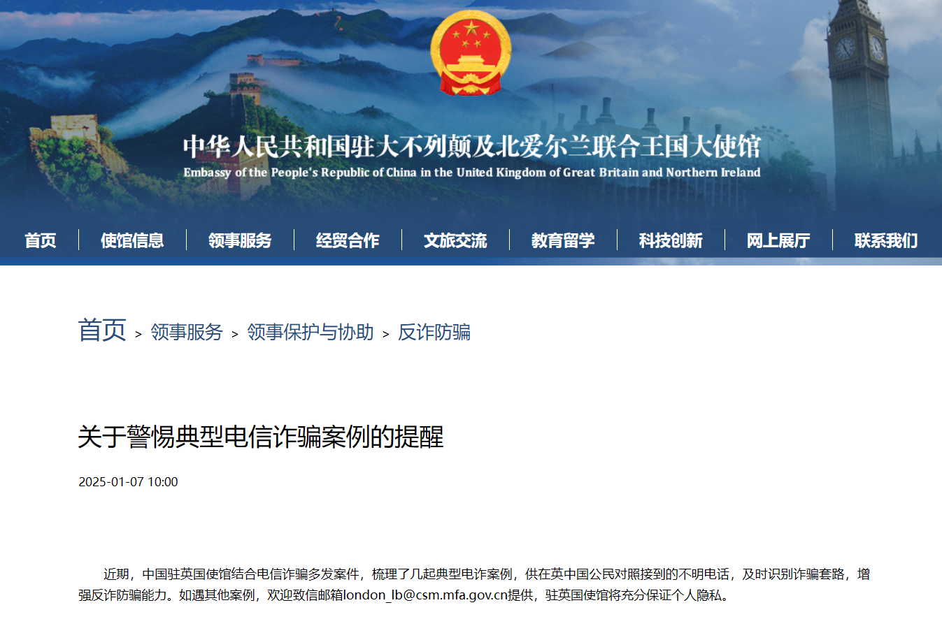 駐英國(guó)使館:發(fā)布電信詐騙典型案例,提醒留學(xué)生及時(shí)識(shí)別詐騙套路