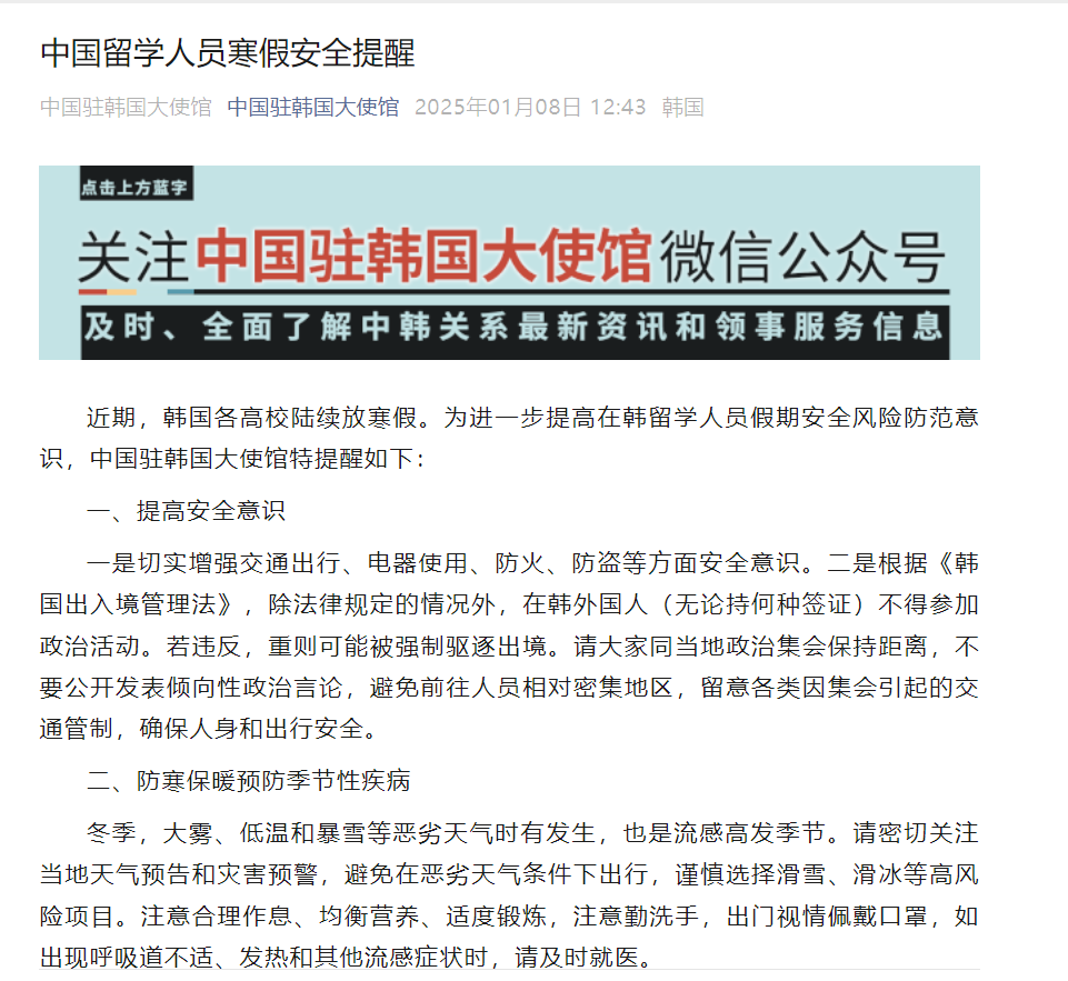 駐韓國(guó)使館:提醒中國(guó)留學(xué)人員寒假注意安全