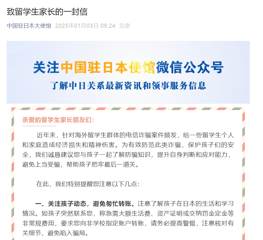 駐日本使館:提醒留學(xué)生與家長(zhǎng)警惕防范電信詐騙