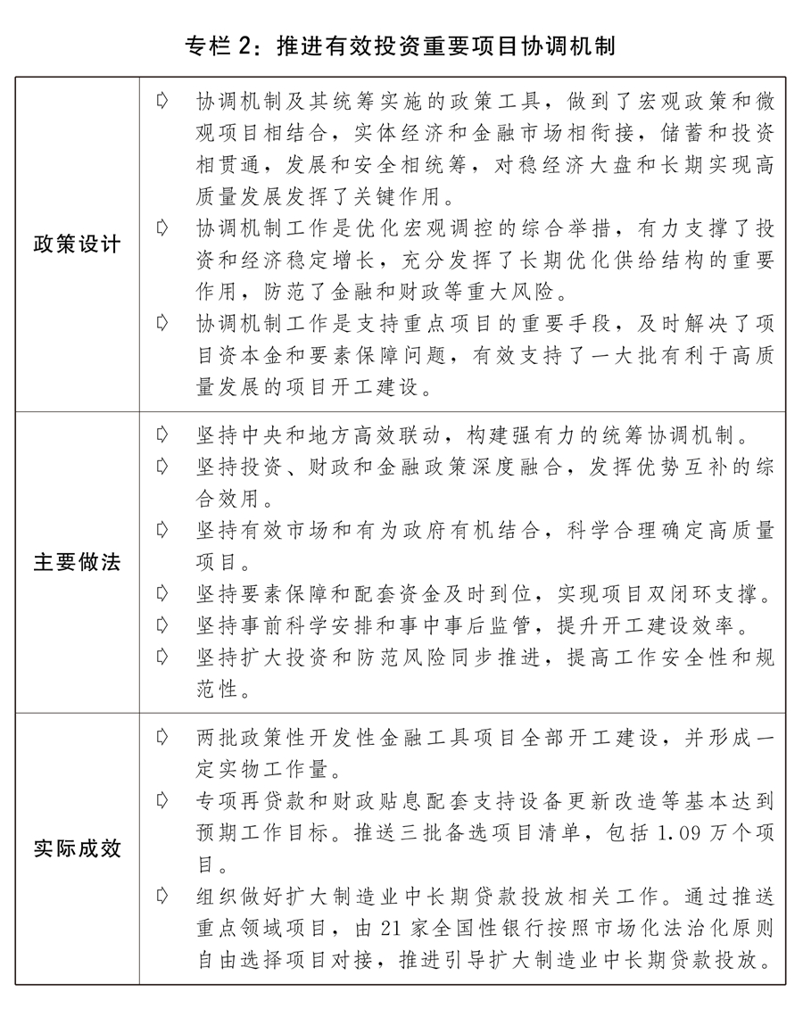 一是投資關(guān)鍵作用充分發(fā)揮。建立并高效運(yùn)轉(zhuǎn)推進(jìn)有效投資重要項(xiàng)目協(xié)調(diào)機(jī)制,強(qiáng)化用地、環(huán)評(píng)、用能等要素保障和重大問(wèn)題協(xié)調(diào),做到“資金、要素跟著項(xiàng)目走”,加快推進(jìn)重點(diǎn)任務(wù)落實(shí)和重大項(xiàng)目建設(shè),努力形成更多實(shí)物工作量。創(chuàng)新設(shè)立政策性開(kāi)發(fā)性金融工具,分兩批投放基金7400億元,為重大項(xiàng)目建設(shè)補(bǔ)充資本金,支持的2700多個(gè)重大項(xiàng)目已全部開(kāi)工。通過(guò)專項(xiàng)再貸款與財(cái)政貼息配套支持重點(diǎn)領(lǐng)域設(shè)備更新改造,推動(dòng)擴(kuò)大制造業(yè)中長(zhǎng)期貸款投放。適度超前開(kāi)展基礎(chǔ)設(shè)施投資,推進(jìn)“十四五”規(guī)劃102項(xiàng)重大工程實(shí)施,新型基礎(chǔ)設(shè)施加快布局,川藏鐵路全面建設(shè)取得良好開(kāi)局,裝機(jī)規(guī)模全球第二大的白鶴灘水電站全面投產(chǎn),白鶴灘至江蘇、浙江特高壓直流輸電工程運(yùn)行,小洋山北側(cè)集裝箱碼頭(陸域部分)、平陸運(yùn)河工程、南水北調(diào)中線引江補(bǔ)漢工程等開(kāi)工建設(shè)。發(fā)揮中央預(yù)算內(nèi)投資撬動(dòng)作用。加快地方政府專項(xiàng)債券發(fā)行使用并進(jìn)一步擴(kuò)大支持范圍。鼓勵(lì)引導(dǎo)社會(huì)資本盤(pán)活老項(xiàng)目、投入新項(xiàng)目,促進(jìn)存量資產(chǎn)和新增投資良性循環(huán),已累計(jì)發(fā)行上市基礎(chǔ)設(shè)施領(lǐng)域不動(dòng)產(chǎn)投資信托基金(REITs)試點(diǎn)項(xiàng)目24個(gè),總發(fā)行規(guī)模超過(guò)780億元。全面推進(jìn)城鎮(zhèn)老舊小區(qū)改造,全國(guó)實(shí)際新開(kāi)工老舊小區(qū)改造5.25萬(wàn)個(gè)。城市基礎(chǔ)設(shè)施建設(shè)短板加快補(bǔ)齊,城市燃?xì)夤艿赖壤匣赂脑旆e極推進(jìn)。全國(guó)固定資產(chǎn)投資(不含農(nóng)戶)57.21萬(wàn)億元,增長(zhǎng)5.1%;其中,基礎(chǔ)設(shè)施、制造業(yè)投資分別增長(zhǎng)9.4%、9.1%,一定程度彌補(bǔ)了消費(fèi)收縮缺口。