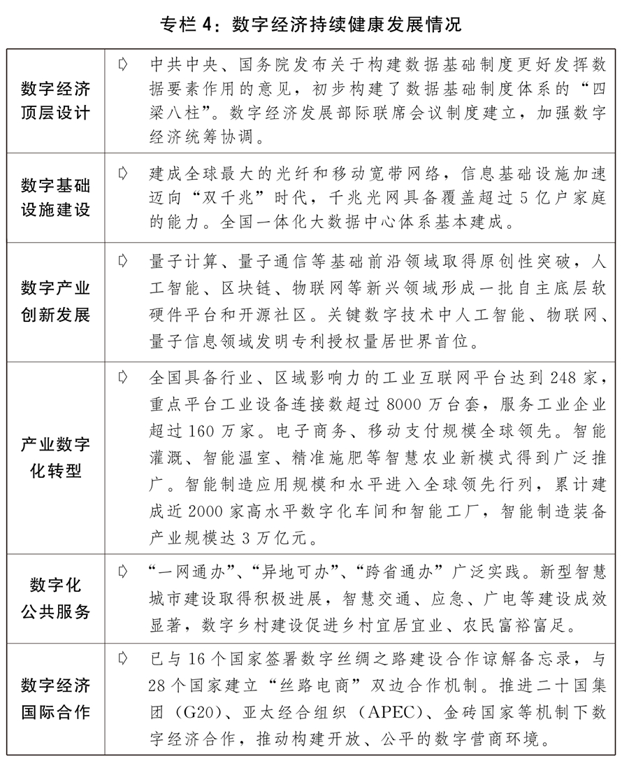三是數(shù)字經(jīng)濟(jì)持續(xù)健康發(fā)展。制定實(shí)施構(gòu)建數(shù)據(jù)基礎(chǔ)制度更好發(fā)揮數(shù)據(jù)要素作用的政策文件,加快完善數(shù)據(jù)基礎(chǔ)制度體系,統(tǒng)籌推進(jìn)數(shù)據(jù)確權(quán)、流通交易、收益分配、安全治理。數(shù)字經(jīng)濟(jì)和實(shí)體經(jīng)濟(jì)深度融合發(fā)展,“東數(shù)西算”工程全面實(shí)施,國(guó)家算力網(wǎng)絡(luò)加快構(gòu)建,加強(qiáng)對(duì)樞紐節(jié)點(diǎn)算力基礎(chǔ)設(shè)施適度超前建設(shè)的政策支持,深入推進(jìn)傳統(tǒng)產(chǎn)業(yè)、中小企業(yè)數(shù)字化轉(zhuǎn)型,“上云用數(shù)賦智”水平不斷提升。信息通信設(shè)施加快發(fā)展,第五代移動(dòng)通信(5G)建設(shè)全球領(lǐng)先,全年新建5G基站88.7萬(wàn)個(gè),累計(jì)建成231.2萬(wàn)個(gè),占全球總數(shù)的60%以上。寬帶光纖網(wǎng)絡(luò)加速布局,千兆城市已超過(guò)110個(gè)。實(shí)現(xiàn)平臺(tái)經(jīng)濟(jì)常態(tài)化監(jiān)管,平臺(tái)經(jīng)濟(jì)規(guī)范健康持續(xù)發(fā)展的基礎(chǔ)進(jìn)一步夯實(shí)。