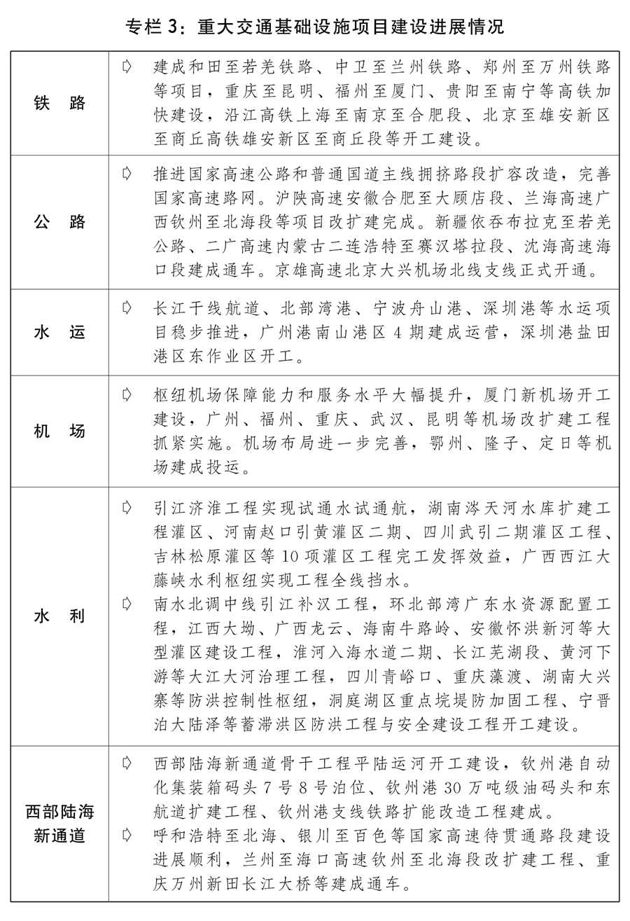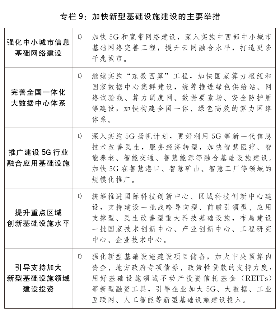三是持續(xù)推進(jìn)重大基礎(chǔ)設(shè)施建設(shè)。優(yōu)化基礎(chǔ)設(shè)施布局、結(jié)構(gòu)、功能和系統(tǒng)集成,構(gòu)建現(xiàn)代化基礎(chǔ)設(shè)施體系。推動(dòng)川藏鐵路、沿江沿海高鐵、國(guó)家水網(wǎng)等重大項(xiàng)目建設(shè),加快重大引調(diào)水、防洪減災(zāi)、西部陸海新通道、小洋山北側(cè)集裝箱碼頭開(kāi)發(fā)建設(shè),推進(jìn)川藏公路G318線提質(zhì)改造,加快沿邊國(guó)道G219線、G331線待貫通路段建設(shè),推進(jìn)中西部鐵路、長(zhǎng)江黃金水道、過(guò)江通道、重點(diǎn)城市群都市圈城際鐵路和市域(郊)鐵路建設(shè)。加快5G、人工智能、大數(shù)據(jù)、物聯(lián)網(wǎng)、工業(yè)互聯(lián)網(wǎng)等新型基礎(chǔ)設(shè)施建設(shè),推動(dòng)智慧高速公路建設(shè),推進(jìn)民用空間基礎(chǔ)設(shè)施建設(shè),加快推進(jìn)海南商業(yè)航天發(fā)射場(chǎng)建設(shè),優(yōu)化升級(jí)數(shù)字基礎(chǔ)設(shè)施,加快建設(shè)信息網(wǎng)絡(luò)基礎(chǔ)設(shè)施,推進(jìn)云網(wǎng)融合和算網(wǎng)協(xié)同發(fā)展,有序推進(jìn)基礎(chǔ)設(shè)施智能升級(jí)。