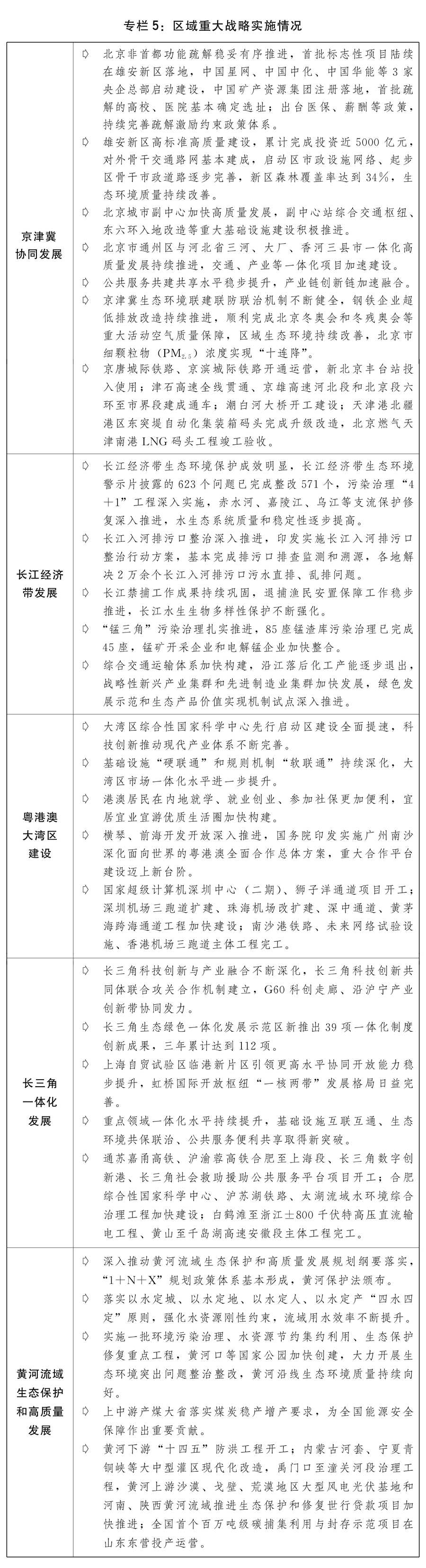 一是區(qū)域重大戰(zhàn)略扎實(shí)推進(jìn)。京津冀協(xié)同發(fā)展水平不斷提升,一批央企、醫(yī)院、高校等疏解項(xiàng)目在雄安新區(qū)落地,津冀港口群基礎(chǔ)設(shè)施不斷完善,“軌道上的京津冀”更加便捷。長(zhǎng)江經(jīng)濟(jì)帶綠色高質(zhì)量發(fā)展有力推進(jìn),長(zhǎng)江保護(hù)法深入貫徹實(shí)施,生態(tài)環(huán)境突出問(wèn)題整改、污染治理“4+1”工程成效明顯,入河排污口整治等專項(xiàng)行動(dòng)深入實(shí)施,長(zhǎng)江流域重點(diǎn)水域十年禁漁進(jìn)展良好。大灣區(qū)綜合性國(guó)家科學(xué)中心先行啟動(dòng)區(qū)加快建設(shè),設(shè)施聯(lián)通和規(guī)則銜接不斷深化,橫琴、前海、南沙、河套等重大合作平臺(tái)建設(shè)深入推進(jìn)。積極推動(dòng)長(zhǎng)三角科創(chuàng)與產(chǎn)業(yè)融合發(fā)展,G60科創(chuàng)走廊、沿滬寧產(chǎn)業(yè)創(chuàng)新帶協(xié)同發(fā)力的創(chuàng)新空間布局不斷優(yōu)化,基礎(chǔ)設(shè)施、生態(tài)環(huán)境、公共服務(wù)等重點(diǎn)領(lǐng)域一體化水平明顯提升。黃河流域生態(tài)環(huán)境保護(hù)、水安全保障、文化保護(hù)傳承弘揚(yáng)等專項(xiàng)規(guī)劃出臺(tái)實(shí)施,黃河流域生態(tài)保護(hù)和高質(zhì)量發(fā)展先行區(qū)加快建設(shè),黃河生態(tài)保護(hù)治理五大攻堅(jiān)行動(dòng)穩(wěn)步推進(jìn)。