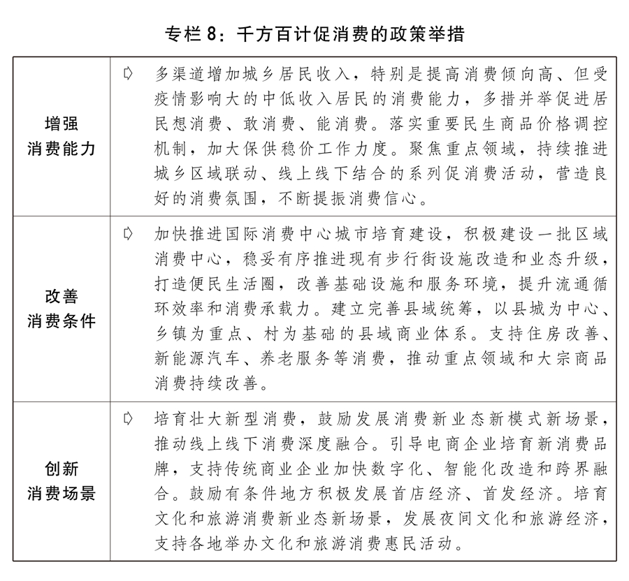 一是綜合施策釋放消費(fèi)潛力。把恢復(fù)和擴(kuò)大消費(fèi)擺在優(yōu)先位置,增強(qiáng)消費(fèi)能力,改善消費(fèi)條件,創(chuàng)新消費(fèi)場(chǎng)景。順應(yīng)居民消費(fèi)升級(jí)趨勢(shì),打造內(nèi)容豐富、品質(zhì)精良、結(jié)構(gòu)合理的高質(zhì)量消費(fèi)供給體系,持續(xù)提升傳統(tǒng)消費(fèi),加快培育新型消費(fèi),不斷壯大消費(fèi)熱點(diǎn)。穩(wěn)定汽車(chē)等大宗消費(fèi),強(qiáng)化停車(chē)設(shè)施建設(shè)改造,優(yōu)化停車(chē)設(shè)施供給結(jié)構(gòu),加快推進(jìn)公路沿線、交通樞紐場(chǎng)站、居住區(qū)等充電設(shè)施設(shè)備建設(shè),推動(dòng)公共領(lǐng)域車(chē)輛全面電動(dòng)化。鼓勵(lì)有條件的地方對(duì)購(gòu)買(mǎi)綠色智能家電、綠色建材等予以支持,持續(xù)開(kāi)展家電生產(chǎn)企業(yè)回收目標(biāo)責(zé)任制行動(dòng)。采取有效措施推動(dòng)生活服務(wù)消費(fèi)恢復(fù),規(guī)范旅游市場(chǎng)秩序,大力發(fā)展城市微旅游、鄉(xiāng)村旅游和短途周邊游。落實(shí)帶薪休假制度。推進(jìn)即時(shí)零售、直播電商、云展會(huì)等新模式健康發(fā)展,拓展沉浸式交互式購(gòu)物體驗(yàn)。支持剛性和改善性住房、新能源汽車(chē)、養(yǎng)老服務(wù)、教育醫(yī)療文化體育服務(wù)等消費(fèi)。引導(dǎo)培育信息消費(fèi)。開(kāi)展智慧商圈、智慧商店、智慧景區(qū)、旅游城市和綠色商場(chǎng)示范創(chuàng)建,擴(kuò)大綠色產(chǎn)品供給和消費(fèi)。促進(jìn)老字號(hào)創(chuàng)新發(fā)展。高水平辦好2023年中國(guó)品牌日系列活動(dòng),不斷提升中國(guó)品牌知名度和影響力,推動(dòng)國(guó)潮品牌消費(fèi)繁榮發(fā)展。營(yíng)造安心放心的消費(fèi)環(huán)境,加大消費(fèi)品質(zhì)量安全監(jiān)管力度,強(qiáng)化消費(fèi)者權(quán)益保護(hù)。