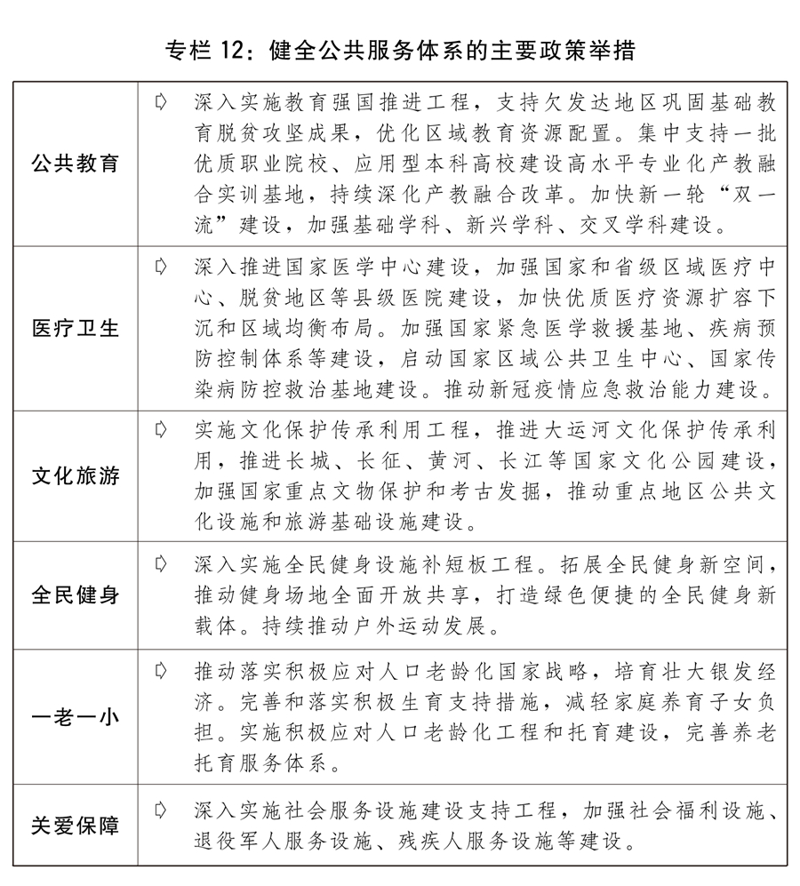 六是健全公共服務(wù)體系。出臺(tái)新版國(guó)家基本公共服務(wù)標(biāo)準(zhǔn),開(kāi)展基本公共服務(wù)均等化監(jiān)測(cè)評(píng)估。持續(xù)推動(dòng)生活性服務(wù)業(yè)補(bǔ)短板上水平,研究出臺(tái)推進(jìn)高品質(zhì)生活城市建設(shè)的政策措施。加強(qiáng)農(nóng)村公共服務(wù)體系建設(shè),健全常住地提供基本公共服務(wù)制度。深入實(shí)施積極應(yīng)對(duì)人口老齡化國(guó)家戰(zhàn)略,發(fā)展養(yǎng)老事業(yè)和養(yǎng)老產(chǎn)業(yè),擴(kuò)大普惠養(yǎng)老供給,構(gòu)建居家社區(qū)機(jī)構(gòu)相協(xié)調(diào)、醫(yī)養(yǎng)康養(yǎng)相結(jié)合的養(yǎng)老服務(wù)體系,加強(qiáng)老年健康服務(wù)和管理,研究支持銀發(fā)經(jīng)濟(jì)發(fā)展的政策體系。推動(dòng)落實(shí)積極生育支持措施,發(fā)展普惠托育服務(wù)體系,降低生育、養(yǎng)育、教育成本,促進(jìn)人口長(zhǎng)期均衡發(fā)展。持續(xù)完善“一老一小”服務(wù)體系,擴(kuò)大養(yǎng)老托育服務(wù)供給。有序推進(jìn)第二批國(guó)家兒童友好城市建設(shè)。大力發(fā)展社會(huì)主義先進(jìn)文化,實(shí)施文化保護(hù)傳承利用工程,加大文物和文化遺產(chǎn)保護(hù)力度,健全現(xiàn)代公共文化服務(wù)體系,推進(jìn)實(shí)施國(guó)家文化數(shù)字化,創(chuàng)新實(shí)施文化惠民工程,建好用好國(guó)家文化公園,推動(dòng)智慧廣電、智慧旅游建設(shè),促進(jìn)文化和旅游深度融合發(fā)展。繁榮發(fā)展哲學(xué)社會(huì)科學(xué)。實(shí)施全民健身設(shè)施補(bǔ)短板工程,推動(dòng)構(gòu)建更高水平的全民健身公共服務(wù)體系。推動(dòng)家政進(jìn)社區(qū),提升基層家政服務(wù)網(wǎng)點(diǎn)服務(wù)能力。推動(dòng)優(yōu)撫醫(yī)院、光榮院改革提質(zhì),加強(qiáng)烈士紀(jì)念設(shè)施提質(zhì)改造,繼續(xù)加強(qiáng)精神衛(wèi)生福利設(shè)施、省級(jí)盲人按摩醫(yī)院等建設(shè)。加強(qiáng)公共法律服務(wù)體系建設(shè)。