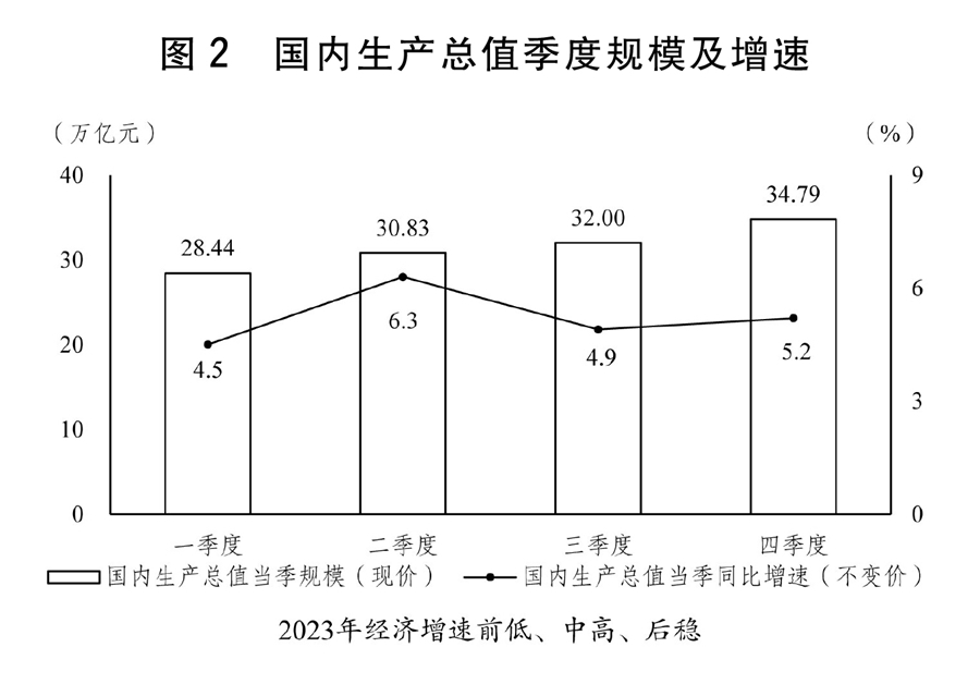 ??2023年是全面貫徹黨的二十大精神的開局之年,是三年新冠疫情防控轉段后經濟恢復發展的一年。在以習近平同志為核心的黨中央堅強領導下,各地區各部門堅持以習近平新時代中國特色社會主義思想為指導,全面貫徹黨的二十大和二十屆二中全會精神,深入開展學習貫徹習近平新時代中國特色社會主義思想主題教育,按照黨中央、國務院決策部署,認真執行十四屆全國人大一次會議審查批準的2023年國民經濟和社會發展計劃,落實全國人大財政經濟委員會審查意見,頂住外部壓力、克服內部困難,堅持穩中求進工作總基調,完整、準確、全面貫徹新發展理念,加快構建新發展格局,著力推動高質量發展,全面深化改革開放,加大宏觀調控力度,著力擴大內需、優化結構、提振信心、防范化解風險,新冠疫情防控實現平穩轉段、取得重大決定性勝利,我國經濟波浪式發展、曲折式前進,總體回升向好,主要發展目標任務圓滿完成,高質量發展扎實推進,全面建設社會主義現代化國家邁出堅實步伐。