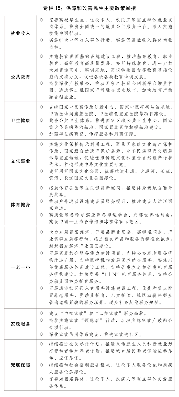 ??四是促進社會事業繁榮發展。推動義務教育優質均衡發展和城鄉一體化,改善農村寄宿制學校辦學條件,提高職業教育質量,建設中國特色、世界一流的大學和優勢學科,實施高等教育綜合改革試點,研究優質高等教育資源擴容、優化學科專業和區域布局,增強中西部和東北地區高校辦學實力。推進教育高水平對外開放。加強精神文明建設,大力發展社會主義先進文化,推動中華優秀傳統文化創造性轉化、創新性發展。加強文化遺產保護傳承利用,推動文化事業和文化產業繁榮發展。加強文化遺產普查認定,開展第四次全國文物普查,建設國家文化遺產資源大數據庫。加強歷史文化名城、街區、村鎮等整體保護和活態傳承。推進中華文明探源。保護傳承弘揚好長江、黃河文化。建好用好國家文化公園。推動實施重大文化產業項目帶動戰略,進一步完善相關政策。創新實施文化惠民工程,加強重大公共文化和旅游設施建設,推動文化和旅游深度融合和高質量發展。發展哲學社會科學、新聞出版、廣播影視、文學藝術和檔案等事業。持續推進全民健身工作,推動體育公園和國家步道體系建設,打造戶外運動高質量目的地,加強社會足球場建設利用,普及群眾性公益性賽事活動。推動城市社區嵌入式服務設施建設工程落地生效,讓群眾在家門口享受到優質普惠社區服務。全面加強兒童友好城市建設。開展家政服務質量提升十大行動,深化家政服務產教融合。加強社會服務設施建設,強化對殘疾人等重點群體的關愛與服務。