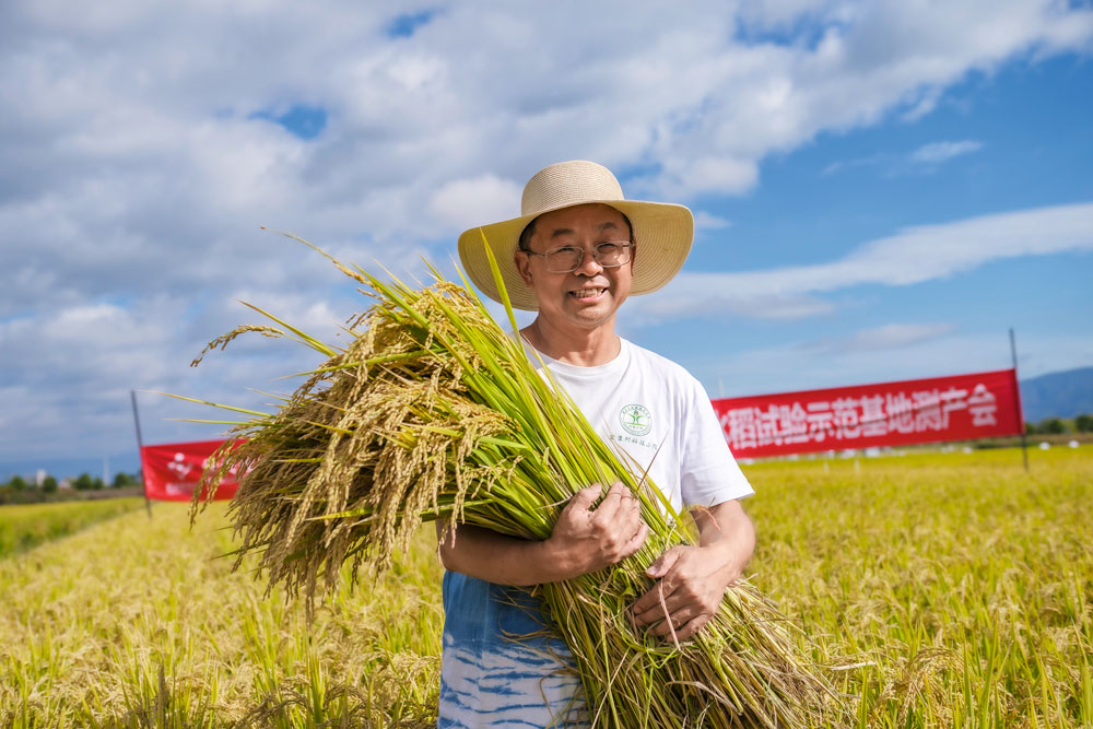 張福鎖在洱海水稻試驗(yàn)田享受豐收的喜悅