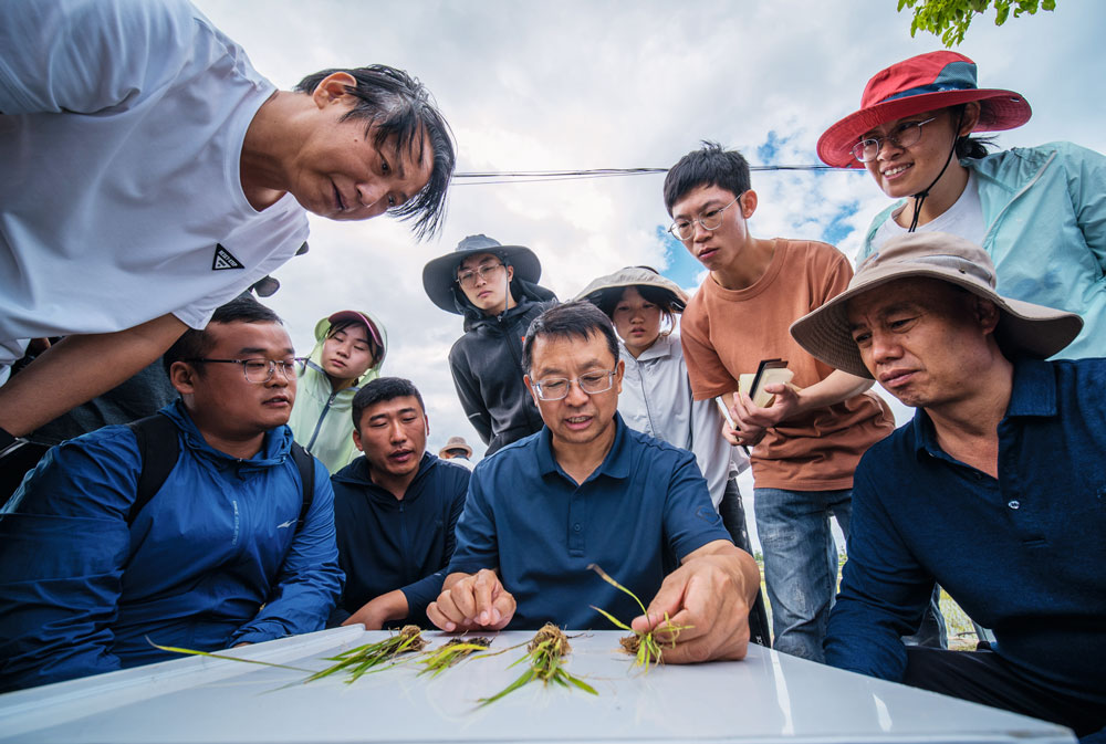 張福鎖(中)與團(tuán)隊(duì)查看洱海水稻試驗(yàn)田苗情