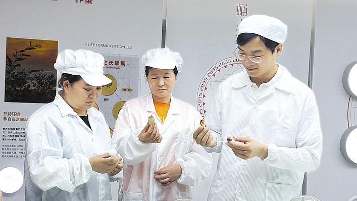 “蛹蟲草又叫北冬蟲夏草,是蟲草菌和柞蠶蛹的復(fù)合體?!币挲堈f(shuō)。在蛹蟲草體驗(yàn)館,一個(gè)個(gè)展示瓶里,展示著不同階段的蛹蟲草,一側(cè)的智慧顯示屏上,蛹蟲草加工和提取車間的實(shí)時(shí)景象一目了然,全過(guò)程可視化、可追溯。