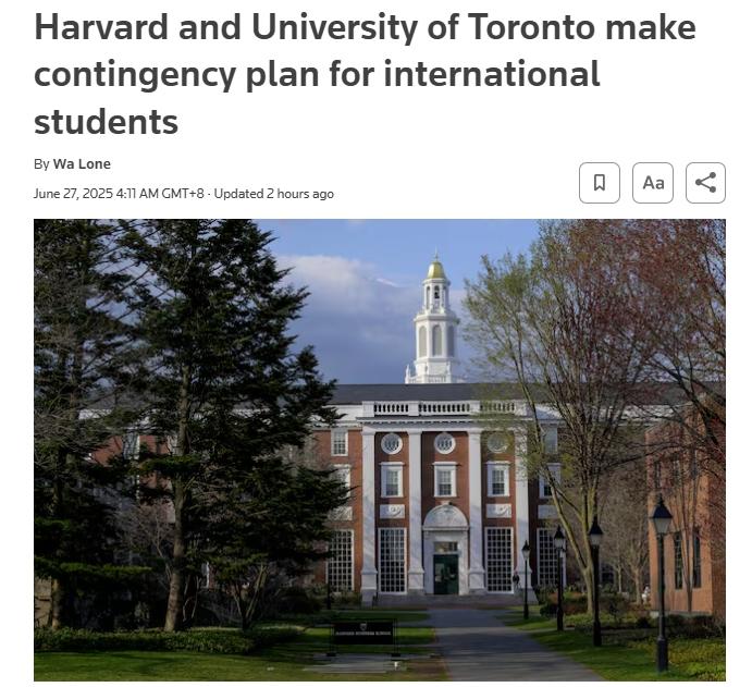 據路透社26日報道,美國哈佛大學和加拿大多倫多大學公布了一項應急計劃,如果美國簽證限制阻止部分哈佛學生返回美國,他們將可以前往加拿大繼續學業。