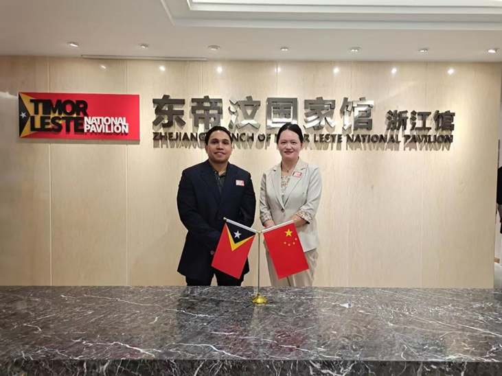 △艾薩克(左)在東帝汶國家館(浙江館)參加交流活動