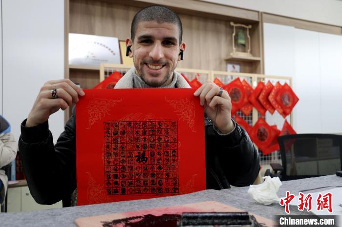 1月29日,一名留學生在安徽博物院展示自己的拓印作品。張強 攝